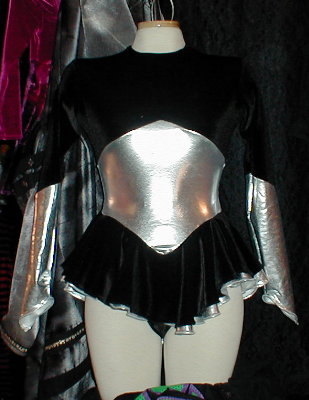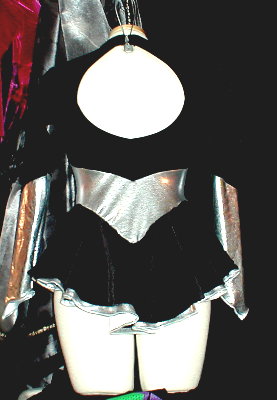 It's of black velvet and silver lycra. The skirt is a double layer skirt, the top skirt of the velvet and the underskirt of the silver. It makes me think of superheroes or something. I hope it gets good bidding on ebay, I spent a good bit of time on it. :>